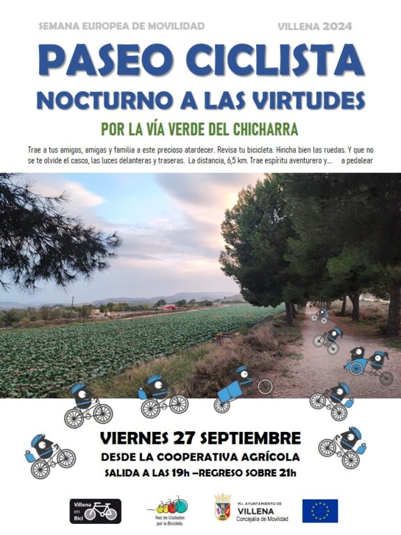 Un paseo por la Vía Verde del Chicharra, saliendo al atardecer y regresando a Villena de noche. Una oportunidad para recordar esta vía verde que fue eje ferroviario de comunicaciones hasta Yecla, y hoy uno de los espacios de paseo de la periferia más frecuentados. Un viaje por espacios de huerta, saleros y otros espacios de interés ambiental. Una aventura para la diversión y la convivencia, y para reivindicar la bicicleta como vehículo sostenible, amable y eficiente. Un paseo de exigencia media, para todo tipo de colectivos, que ya se ha convertido en un clásico en las últimas ediciones de la semana de movilidad.