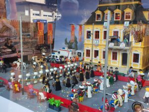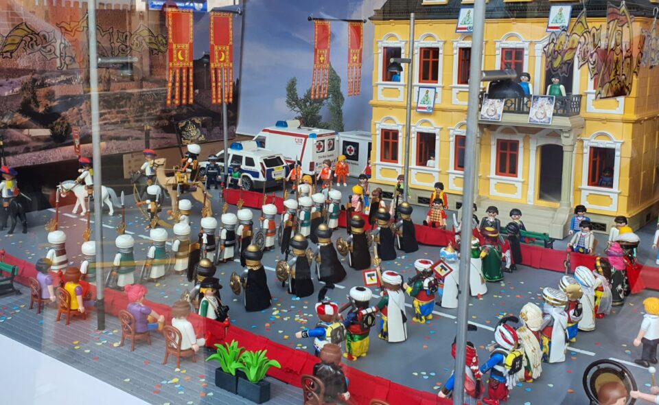 Este año, además de los escaparates festeros, se ha presentado una exposición artesanal realizada por Francisco José Pascual Ruano. Se trata de una representación conmemorativa de las fiestas de Moros y Cristianos de Villena realizada con muñecos de Playmobil personalizados. “La majestuosidad y la grandeza de nuestros moros y cristianos se muestran cuidadosamente con cada detalle en estas réplicas de pequeño formato”, ha explicado la concejala Maite Gandía.