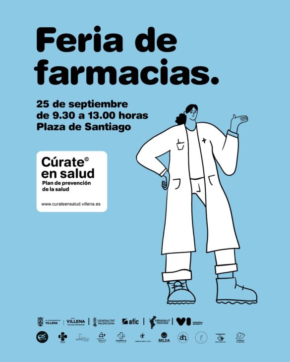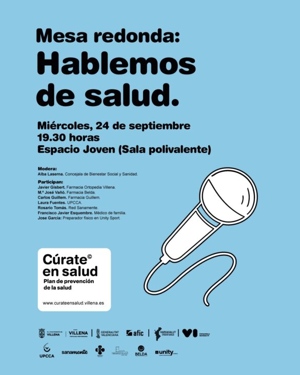 El previo a la Feria será la Mesa Redonda ‘Hablemos en Salud’, que se celebrará en Espacio Joven a las 19.30 horas del miércoles 24 de septiembre. Esta charla estará moderada por Alba Laserna, y participarán profesionales de la farmacia como Javier Gisbert, María José Vañó y Carlos Guillem. En este encuentro, también se sumarán Laura Fuentes, la UPCCA, Rosario Tomás, de Red Sanamente, Francisco Javier Esquembre, médico de familia y José García, preparador físico.