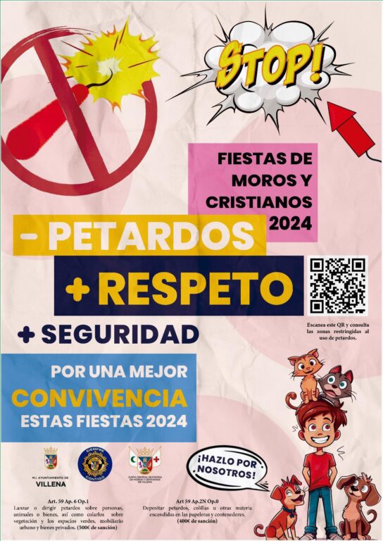 El Ayuntamiento de Villena ha publicado, tal y como se anunció, un bando que regula el uso de la pirotecnia durante las fiestas de Moros y Cristianos. Una medida incluida dentro de la campaña “-Petardos + respeto y + seguridad” impulsada junto a la Policía Local con el objetivo de prevenir, mejorar la seguridad y respetar la convivencia vecinal.