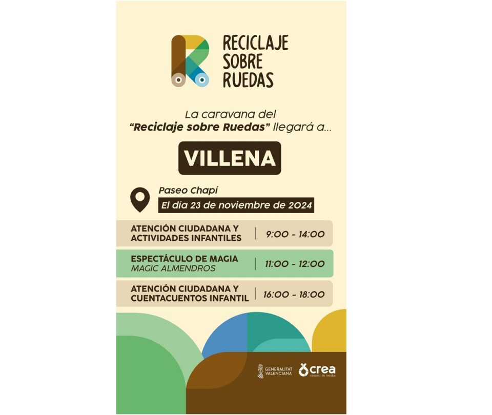 El Ayuntamiento de Villena y el Consorcio CREA han organizado la caravana del ‘Reciclaje sobre Ruedas’, una jornada de sensibilización y concienciación social sobre la necesidad de separar en origen para reciclar mejor, que tendrá lugar el sábado, 23 de noviembre, en el Paseo Chapí. Esta campaña, que recorre los municipios de la provincia y llegará a Villena el sábado, consiste en diferentes actividades infantiles, juegos escolares y cuentacuentos.