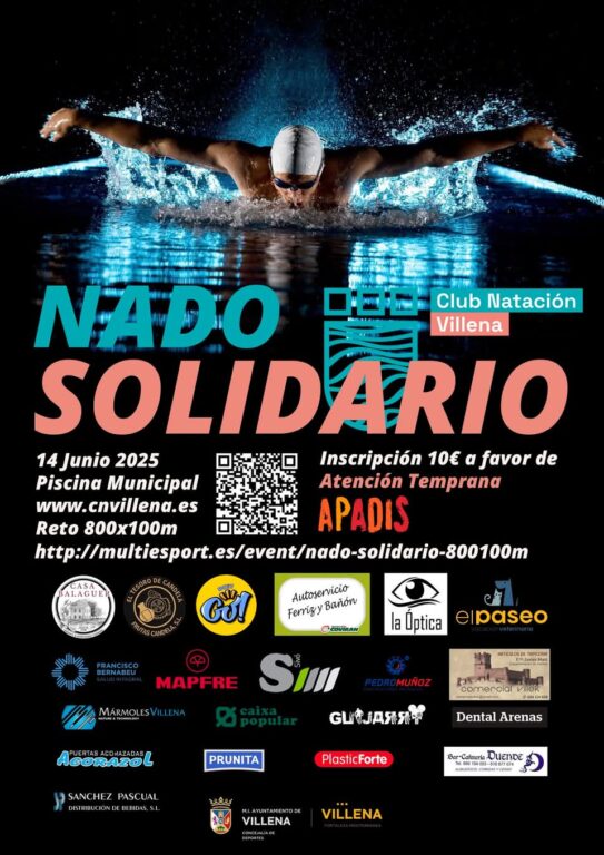 Villena acogerá el próximo 14 de junio el Nado Solidario 2025, una jornada de deporte y solidaridad impulsada por el Club Natación Villena y la colaboración de múltiples entidades locales. El evento se celebrará en la Piscina Municipal, con un reto deportivo de 800 x 100 metros y un objetivo solidario: recaudar fondos a favor del programa de Atención Temprana de APADIS.