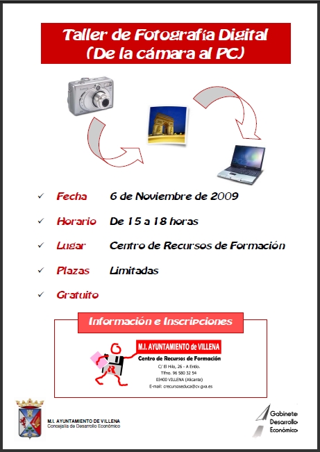 Villena, 27 de octubre.- El Centro de Recursos de Formación a través de la Concejalía de Desarrollo Económico, organiza una nueva edición de su Taller de Fotografía Digital.