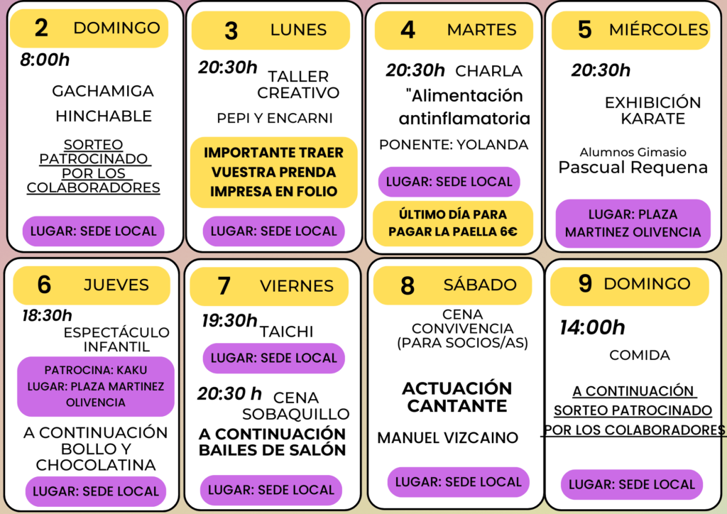 El jueves día 6 continuamos con un espectáculo infantil patrocinado por la kaku en la Plaza Martinez Olivencia a las 18:30h y a continuación en la Calle Celada (sede local) se repartirá un bollo y chocolatinas para socios y con la correspondiente pegatina. El viernes día 7 se realizará un taller de taichi, clase impartida por Esther, y a continuación cena de sobaquillo y acompañamiento con bailes de salón. El sábado día 8 cena de convivencia de socios y socias a las 21h, en la Calle Celada (sede local) y finalizando con una actuación de Manuel Vizcaino que repite este año. Y para finalizar la semana y como novedad el domingo día 9 se realizará la comida de socios en la Calle Celada (sede local) con unas paellas, hora de comida a las 14h.