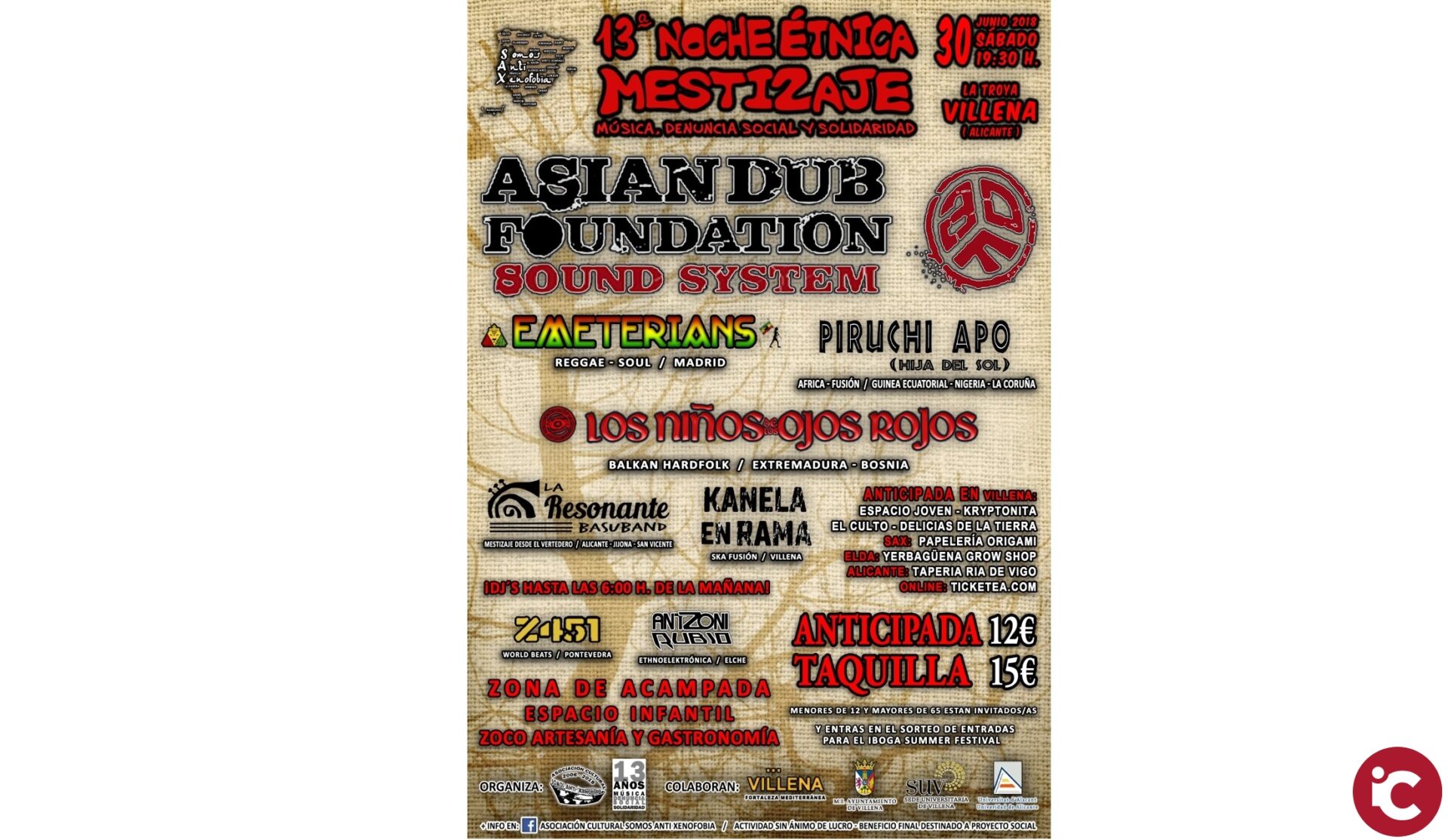 El próximo sábado 30 de Junio llega al Recnito de La Troya en Villena, la décimo tercera edición de este gran evento de Música, Denuncia Social y Solidaridad llamado Noche Étnica Mestizaje. Organizado por la Asociación Cultural sin ánimo de lucro Somos Anti Xenofobia, y con la colaboración del Ayuntamiento de Villena y Sede Universitaria de la localidad. Una vez más éste colectivo socio-cultural quiere invitar a celebrar a través de la música, el mestizaje humano a través del mestizaje musical. Músicos de distintos lugares del planeta para combatir prejuicios raciales y apostar por una sociedad inter-cultural.