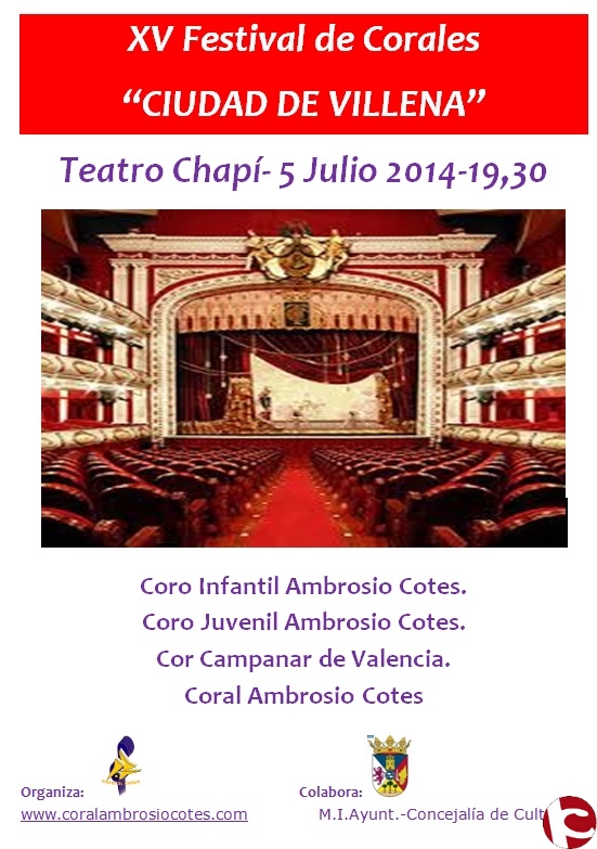 El próximo sábado día 5 a las 19.30 horas se llevará a cabo el XV Festival de Corales «Ciudad de Villena» Será en el Teatro Chapí y participarán las siguientes corales: