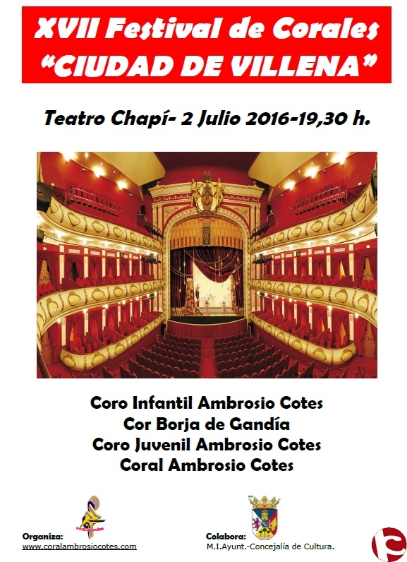 La Coral Ambrosio Cotes, junto con sus coros Infantil y Juvenil ofreceremos el próximo sábado día 2 de Julio a las 19,30 horas en el Teatro Chapí un concierto coral.