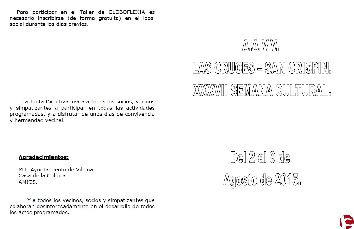 Desde la Asociación de Las Cruces nos han enviado el programa de actos de su XXXVII Semana Cultural, que tendrá lugar entre los días 2 y 9 de Agosto en Villena.