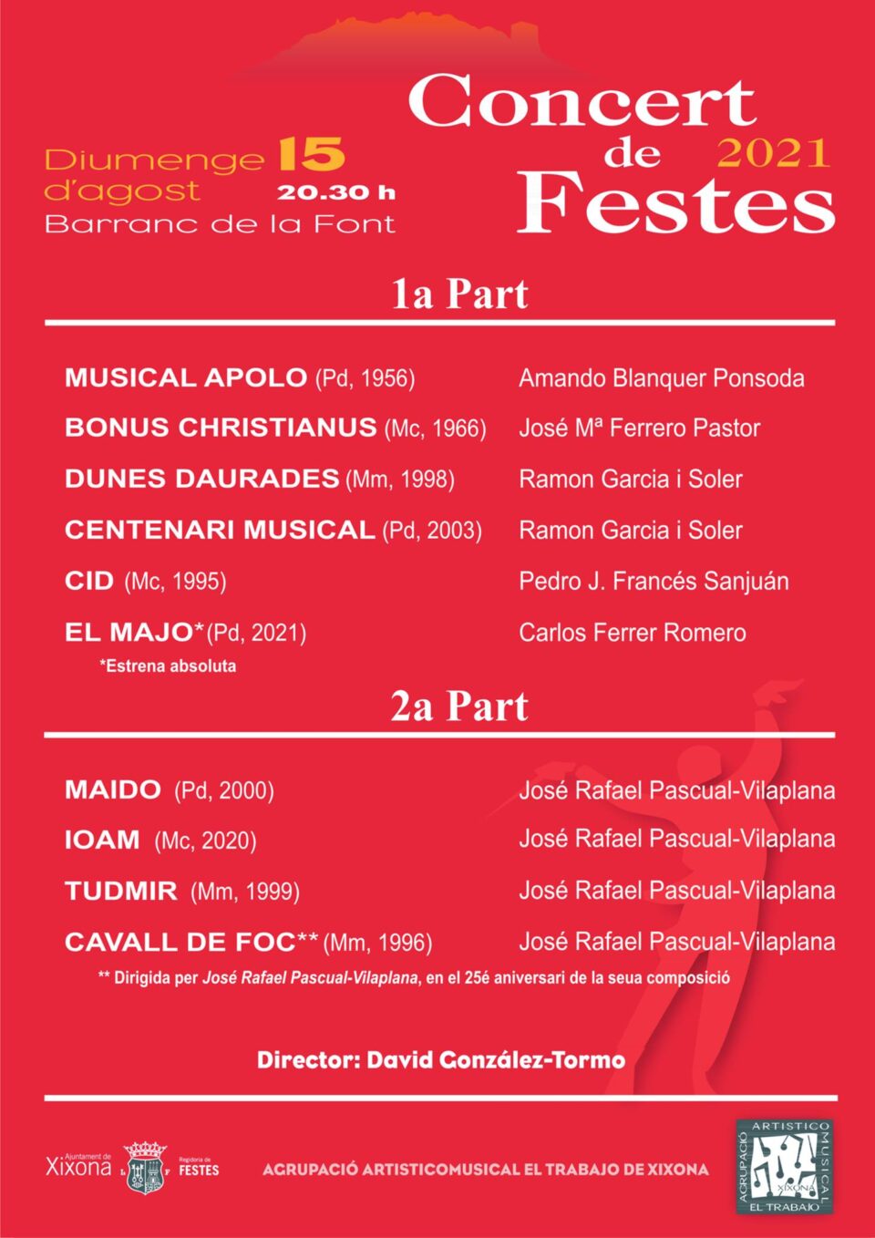 En la segona part, faran un homenatge a la música de José Rafael Pascual-Vilaplana, director de la nostra banda de 1995 a 2002, soci d’honor i medalla d’or del poble de Xixona, i tindrem la presència d’ell i la seua família, i el goig, altra vegada, de què ens dirigisca en la darrera peça del concert, Cavall de Foc.