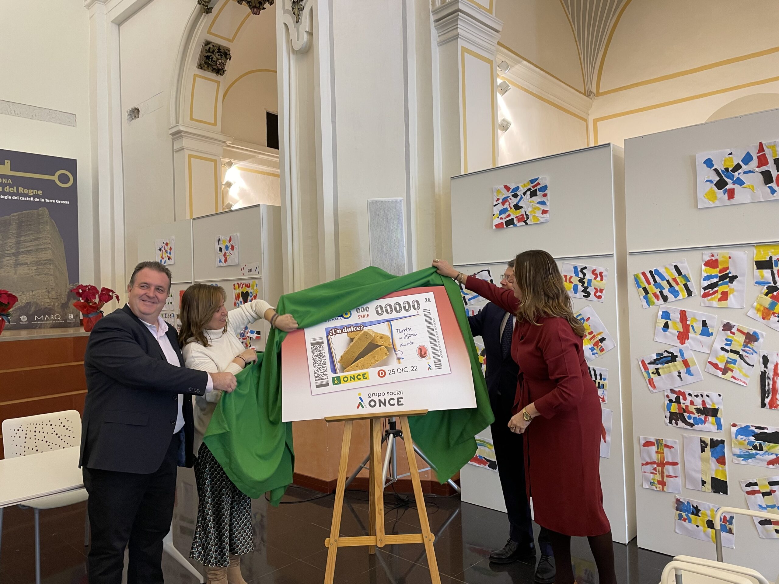 Estela Medina, directora de la ONCE de Alicante ; Adrián López, presidente de los pasteleros artesanos de la provincia de Alicante; Cesár Sóler, presidente del Consejo Regulador Jijona y turrón de Alicante, e Isabel López , alcaldesa de Jijona, han presentado este cupón.
