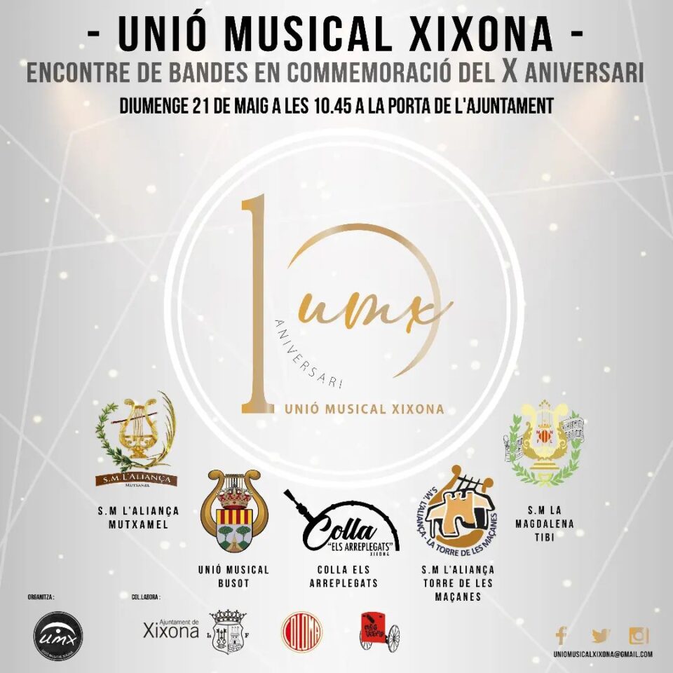 Las agrupaciones la Colla de dolçainers i tabaleters els Arreplegats de Xixona, la Societat Musical L’Aliança de Mutxamel, la Unió Musical de Busot, la S.M La Magdalena de Tibi i la SM L’Aliança La Torre de les Maçanes han aceptado la invitación de la Unió Musical Xixona y participarán el domingo 21 de mayo en este histórico pasacalles, que culminará con la interpretación del himno de fiestas (pasodoble ‘Fiesta en Jijona’ de Vicente Pla), dirigido por Eladio Sellés, director de la UMX en el último lustro.