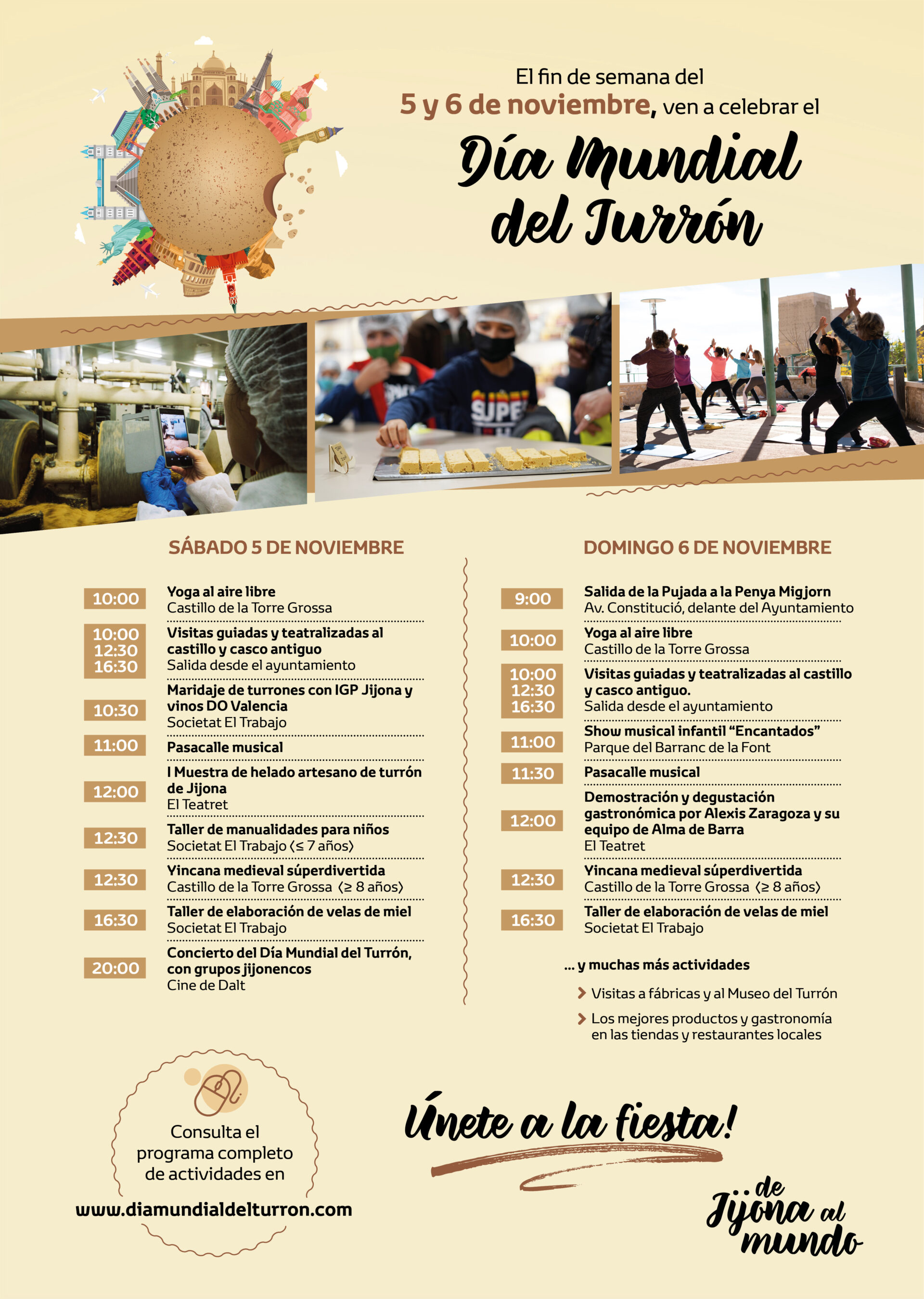 Todas las actividades, así como los enlaces para inscribirse en aquellas que lo requieren, están disponibles en la página web www.diamundialdelturron.com. Además, para poder resolver cualquier duda in situ, el punto de información turística de Xixona se traslada de la Oficina de Turismo al Ayuntamiento, donde atenderá a los visitantes de 10:00 a 13:00h.