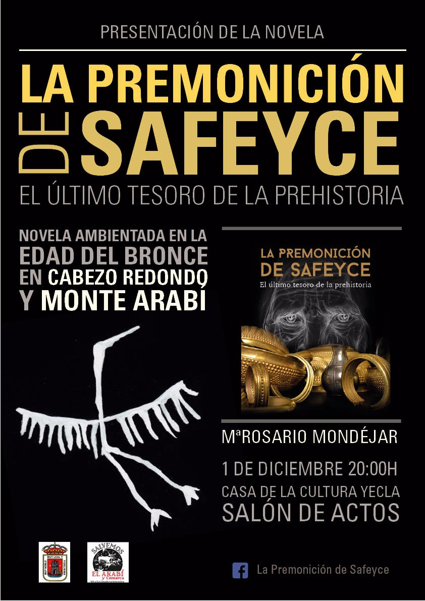 La Plataforma Ciudadana Salvemos el Arabí y Comarca ha organizado para el próximo viernes 1 de diciembre, a las 20:00h, en la Casa de Cultura de Yecla, la presentación de la novela La premonición de Safeyce. El último tesoro de la Prehistoria, de la autora villenera Mª Rosario Mondéjar.